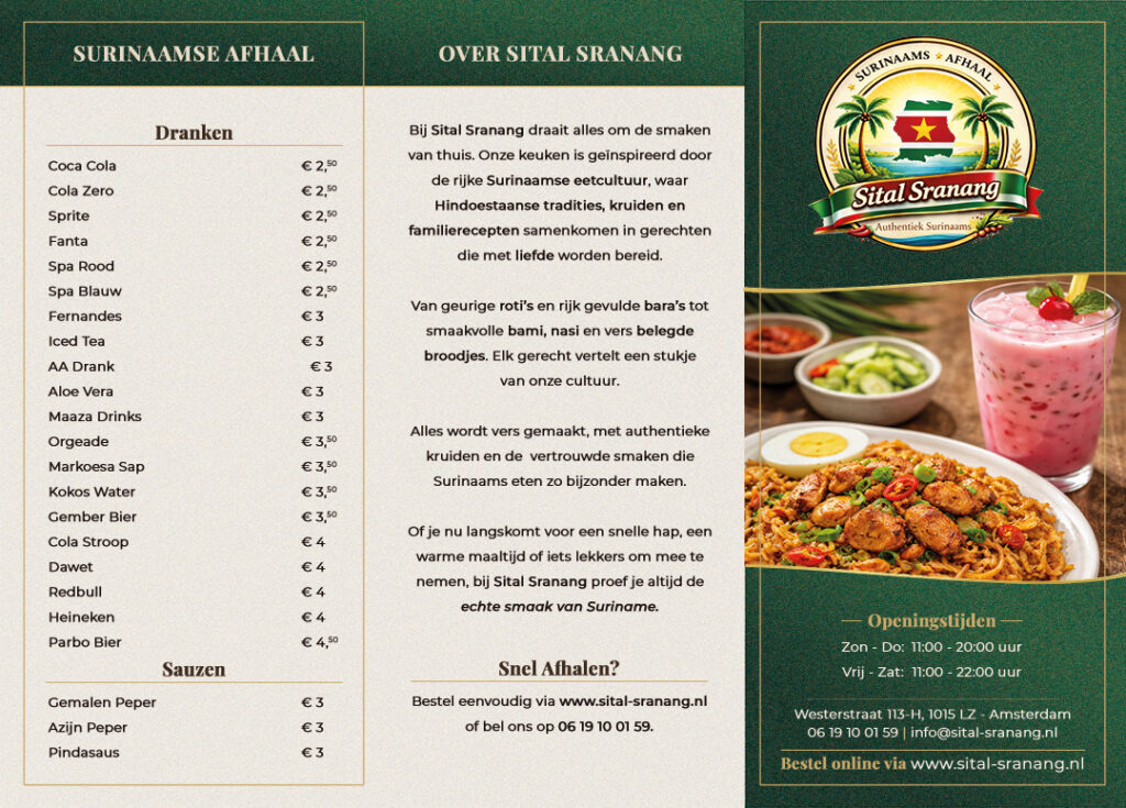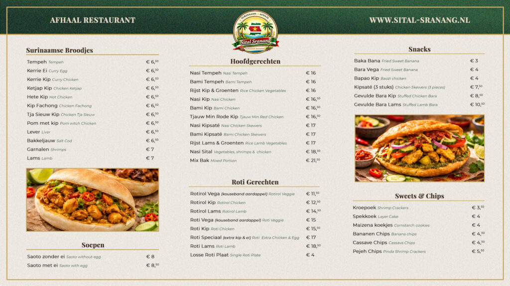Welkom bij Sital Sranang Almere! Hieronder vindt u onze heerlijke Surinaamse gerechten, allemaal 100% halal en bereid met liefde en authenticiteit.